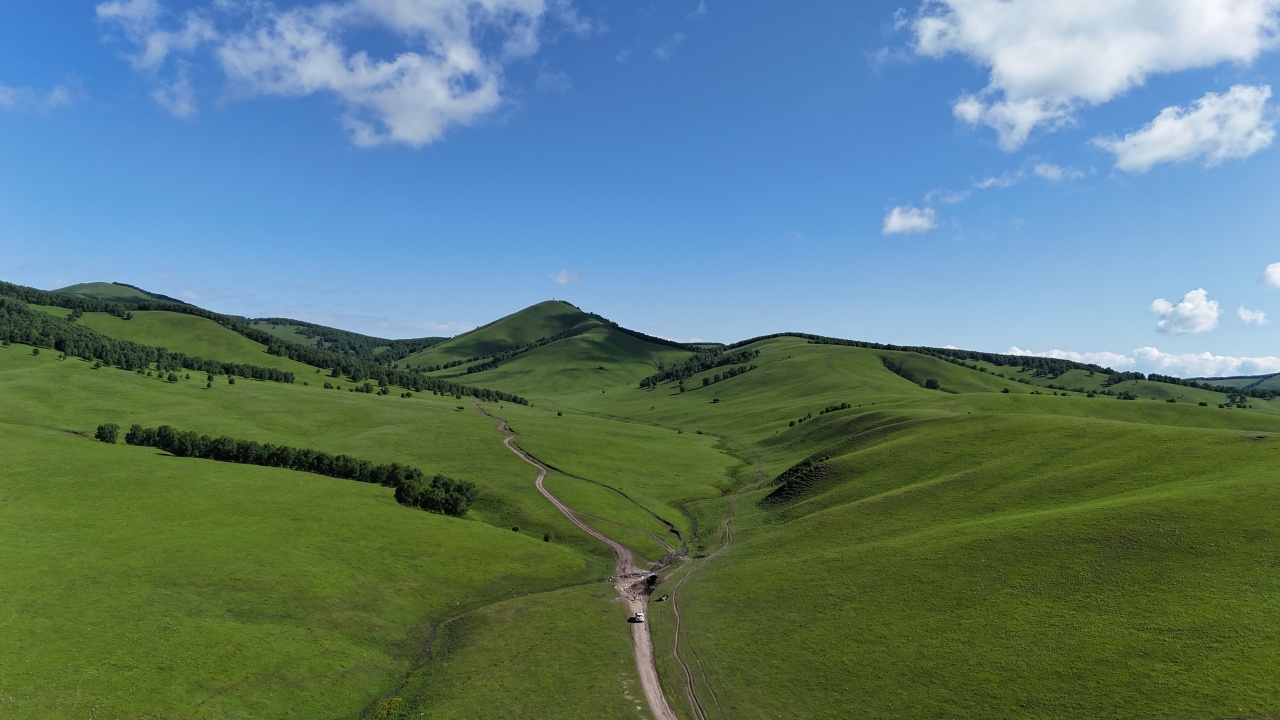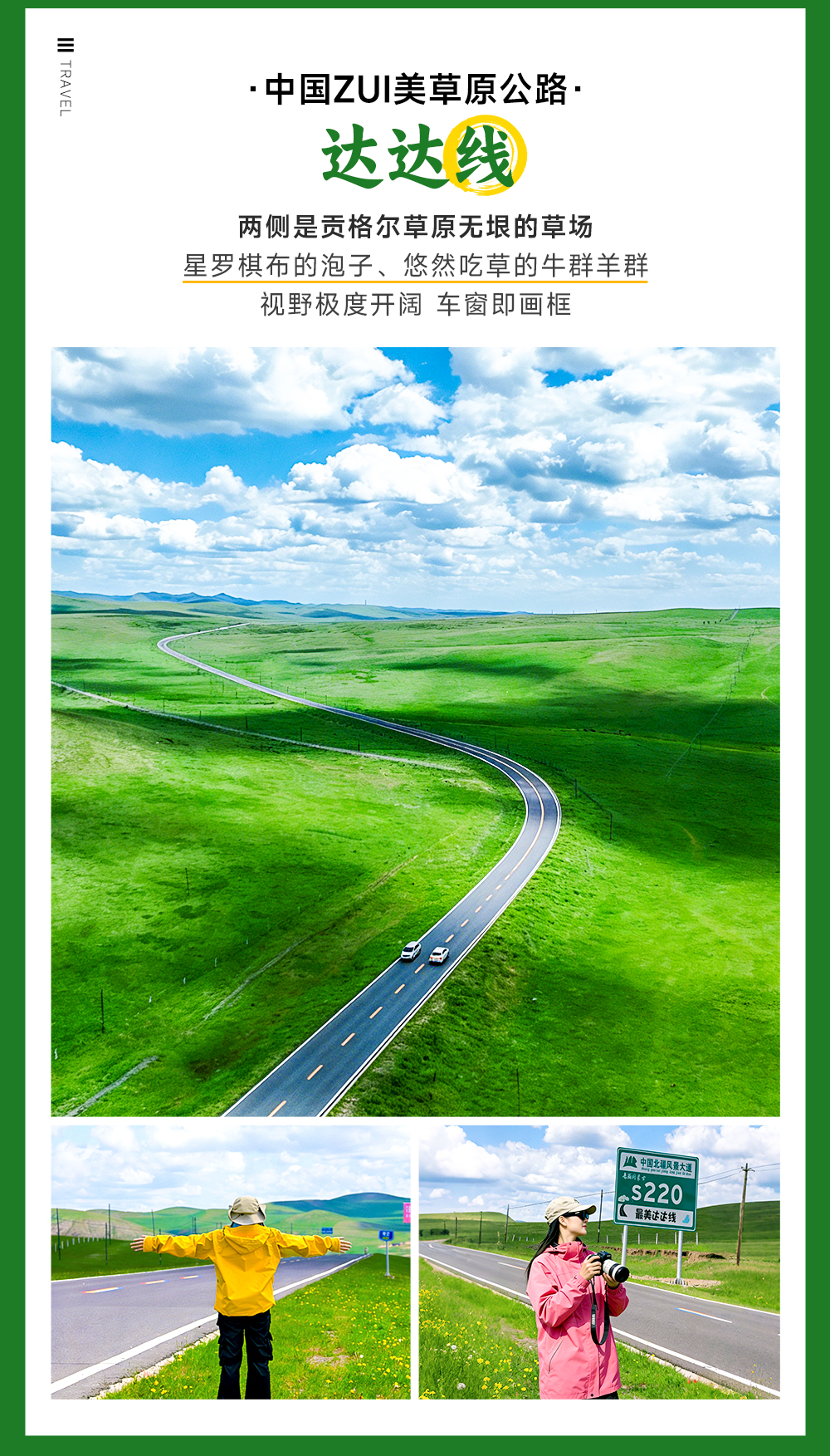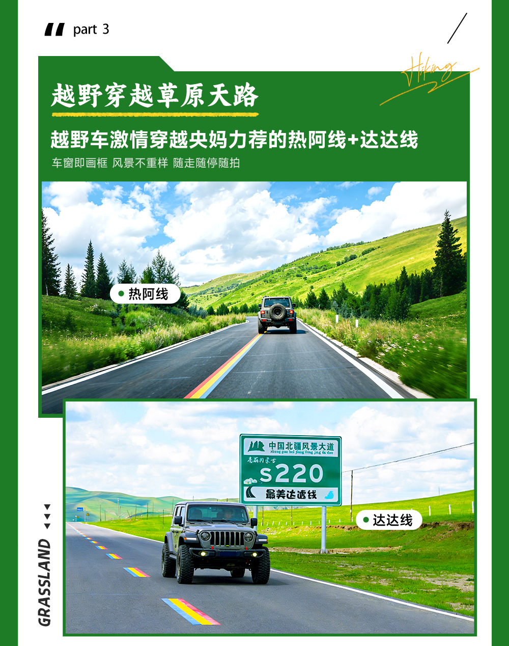 徒步结束后,乘坐越野穿越醉美草原天路【热阿线、达达线】,看两侧风光无限,笔直的公路延伸到天尽头,邂逅贡格尔草原。