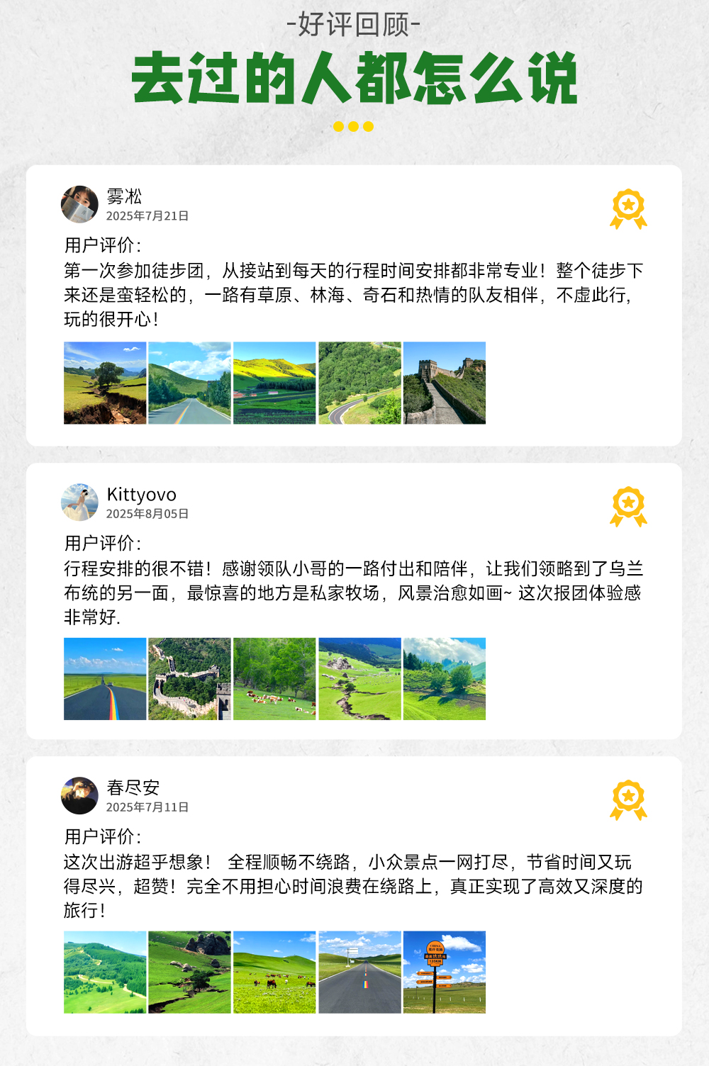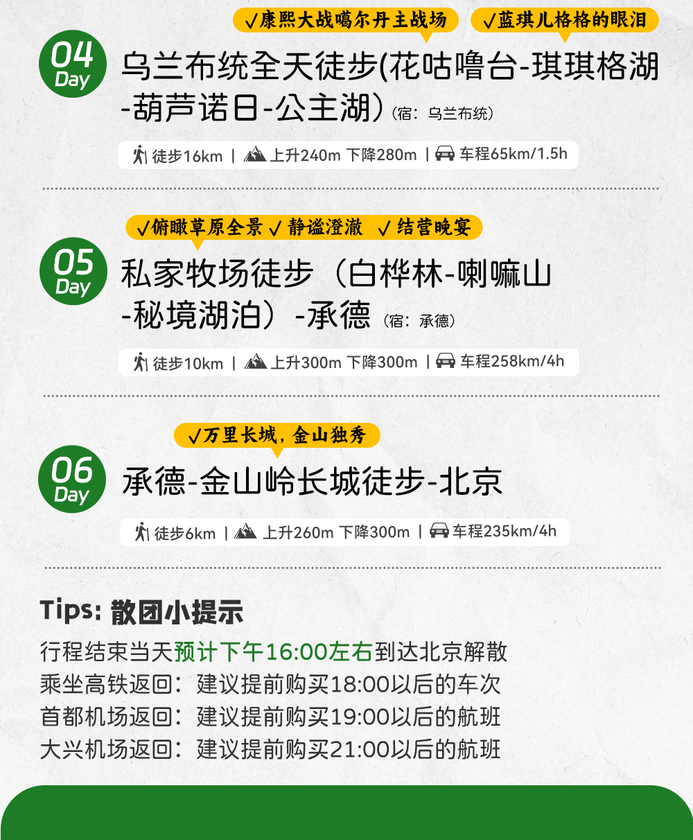 中午在景区附近自由午餐或领队组织AA吃饭,下午集合返京(车程约2.5小时)。非常幸运和大家共享草原之旅,期待我们的下次相遇。