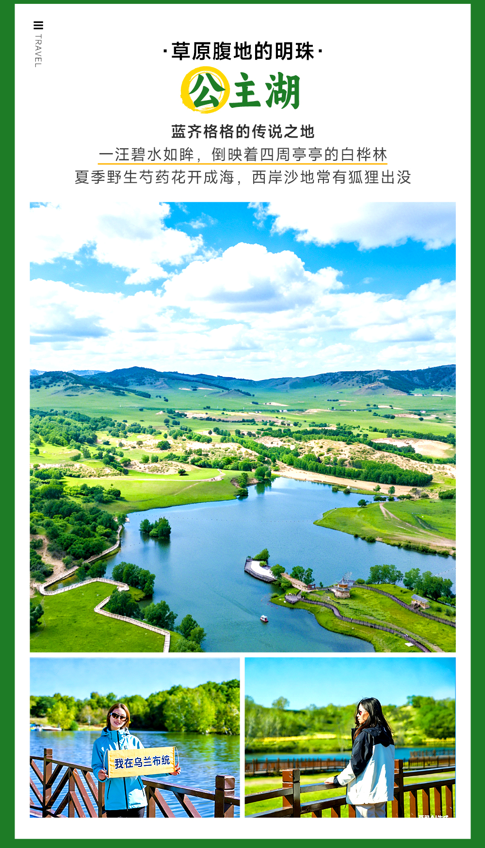 下午我们接着徒步至终点,乘车前往“蓝齐儿眼泪”的坝上明珠【公主湖】,绿林环绕湖水,湖水清凉碧绿,似梵高的油画在人间,美不胜收。沿途牛羊悠闲、白桦错落,田园村落若隐若现,日落在暮色的柔光下更显惊艳。