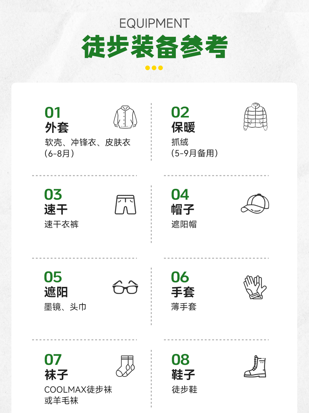 ①衣服:5/6月准备冲锋衣+速干打底,穿速干长袖/皮肤衣+防水长裤;7/8月防晒服+速干短袖即可,早晚准备冲锋衣,9/10月准备冲锋衣+内胆,沿途紫外线强记得带防晒霜和墨镜
