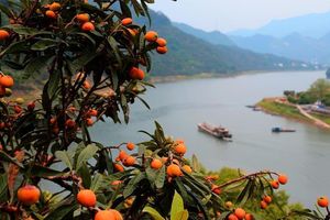 两岸的枇杷林、水雾飘渺的江面、